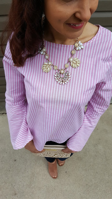 My style: White jeans, basic tank, chambray shirt, my favorite necklace/locket, peep-toe booties and my trusted Nine West spring purse (which I hope to replace with a Kate Spade satchel next month when we go to Disneyworld on a family trip).