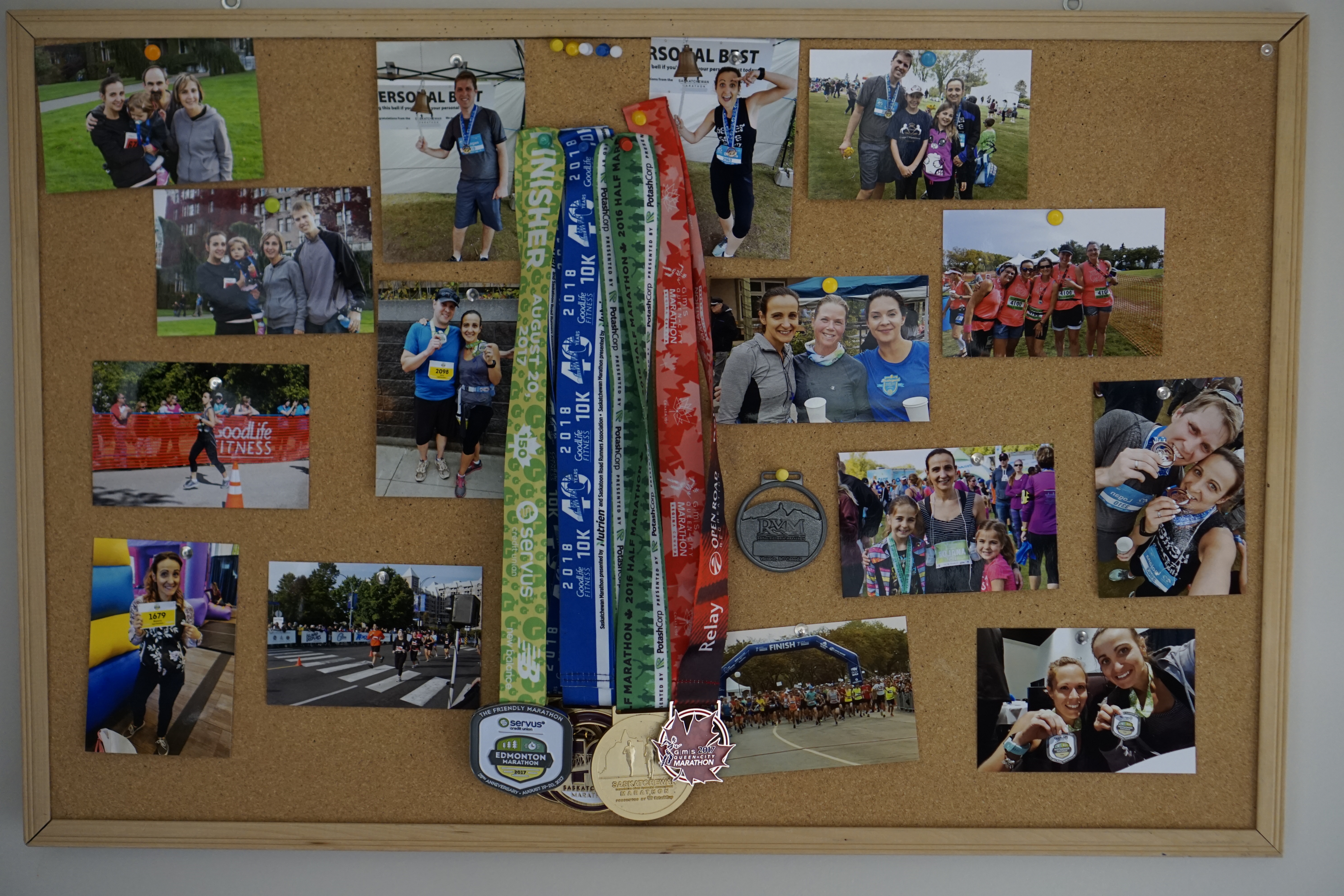 Now let's take a look at the bright, motivational and getting it done space we created. The first and biggest two transformations were putting in new flooring a fresh coat of white paint on the walls and on the closet doors! Siriously those two things opened up this tiny bedroom and made air circulate through it!!! All of a sudden even though it's in the basement, it felt much larger and more inviting. My favortie part of the room is that I found a space to utilize an old pin board, by printing off all the picture from the various 10 km and half- marathons that I have done over the years. Seeing my friends and family with me, cheering me on, reminds me to keep going and how much I love running. It's great to look at on days that I just don't feel like woring out. LOL. Some simple Dollarama frames, with motivational qoutes also hang on the one wall, while I've utilized baskets of various sizes to keep my mats, weights and bands in order. Overall I am happy with the how it turned out.